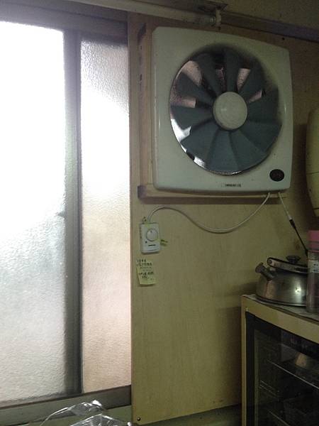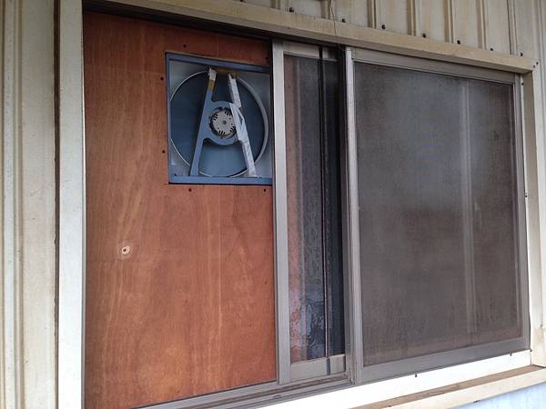 我把排氣扇嵌在木板上,風扇裝在最高處能抽走抽油煙機來不及抽到的油煙和熱氣,如果遇到颱風,窗戶仍可以完全關上